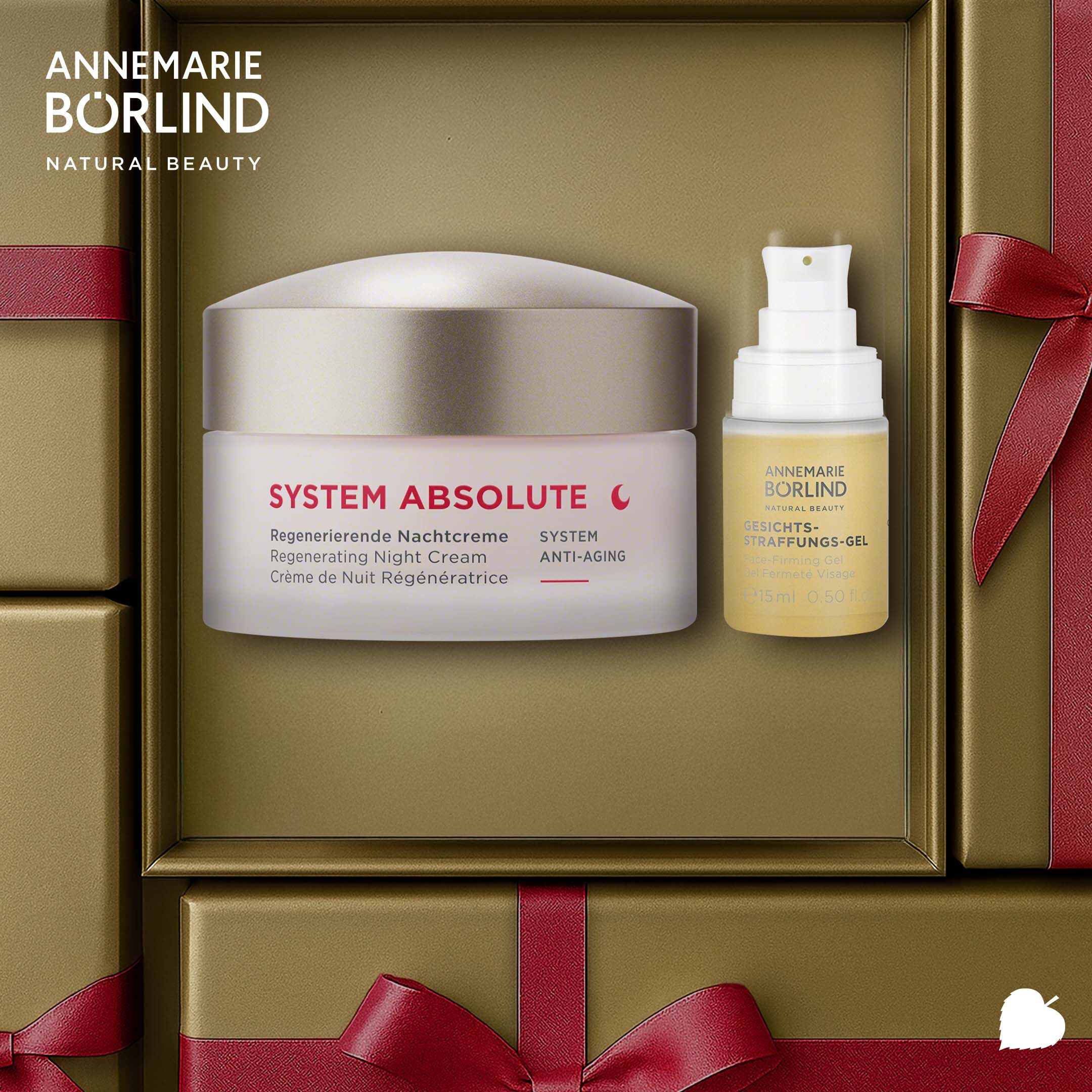 System Absolute Regenerierende Nachtcreme: Aqua [Water], Squalane, Cetearyl Ethylhexanoate, Limnanthes Alba Seed Oil [Meadowfoam], Simmondsia Chinensis Seed Oil [Jojoba], Cera Alba [Beeswax], Glycerin, Sorbitol, Aluminum/Magnesium Hydroxide Stearate, Polyglyceryl-3 Polyricinoleate, Sorbitan Oleate, Phenoxyethanol, Lecithin, Butyrospermum Parkii Butter [Shea], Magnesium Sulfate, Enteromorpha Compressa Extract, Benzyl Alcohol, Aroma [Fragrance], Retinyl Palmitate, Potassium Sorbate, Panthenyl Ethyl Ether, Sodium PCA, Aloe Barbadensis Leaf Juice Powder, Betaine, Helianthus Annuus Seed Oil [Sunflower], Macadamia Ternifolia Seed Oil, Pyridoxine Tripalmitate, Linalyl Acetate, Caesalpinia Spinosa GUM, Sodium Hyaluronate, Benzyl Benzoate, Alcohol, Linalool, Coumarin, Mica, Citrus Aurantium Bergamia Peel Oil, Tocopherol, Limonene, Geraniol, Citronellol, Sodium Benzoate, Pelargonium Graveolens Flower Oil, Ascorbyl Palmitate, Pogostemon Cablin Oil, Pinene, Geranyl Acetate, CI 77491 [Iron Oxides]Gesichts-Straffungs-Gel: Aqua [Water], Alcohol, Glycerin, Xanthan GUM, Betaine, Caprylyl/Capryl Glucoside, Adansonia Digitata Leaf Extract, Babassu Oil Polyglyceryl-4 Esters, Polyglyceryl-10 Laurate, Aroma [Fragrance], Sodium Ascorbyl Phosphate, Ranunculus Ficaria Extract, Rosmarinus Officinalis Leaf Extract [Rosemary], Hexyl Cinnamal, Hamamelis Virginiana Leaf Extract, Equisetum Arvense Extract, Linalool, Sodium Benzoate, Fomes Officinalis Extract [Mushroom], Linalyl Acetate, Citric Acid, Limonene, Citronellol, Potassium Sorbate, Terpineol, Citrus Aurantium Peel Oil, Pinene, Citrus Limon Peel Oil