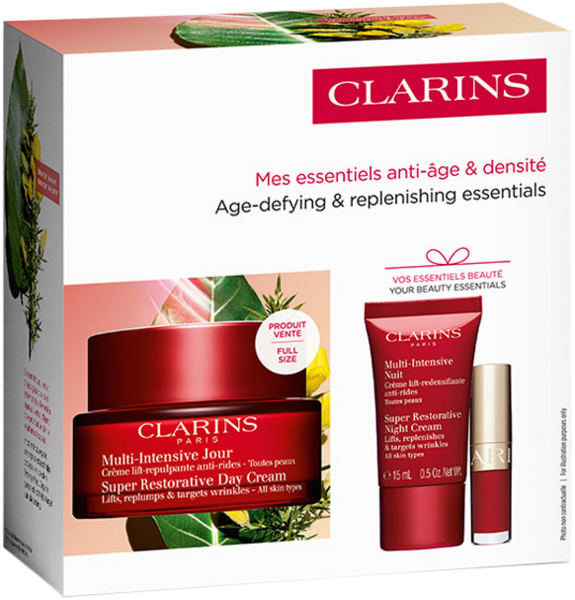 Superintensive Anti-Age Tagescreme mit Lifting-Effekt gegen Falten und Spannkraftverlust für jeden Hauttyp 50+. Diese Tagescreme wirkt den negativen Auswirkungen von altersbedingten Hormonumstellungen auf die Haut entgegen. Eine sofort glatter erscheinende Haut, die Hautdichte wird Tag für Tag verbessert, das Hautbild erscheint gleichmäßiger und wie geliftet. Die Haut strahlt. Das Geheimnis? Ein kraftvolles Duo pflanzlichen Ursprungs: Biologischer Haronga-Extrakt, ein natürlicher Aktivstoff so wirksam wie Retinol*, und biologischer Stechginster-Extrakt tragen zu mehr Hautdichte sowie einem Lifting-Effekt bei und wirken Spannkraftverlust entgegen. Falten werden sichtbar geglättet. Die Haut wird mit Feuchtigkeit versorgt und erscheint aufgepolstert. Die Creme mit zartschmelzender Textur fördert einen gleichmäßigen Teint und lässt die Haut strahlen. Der frische, zart blumige Duft mit pudriger Herznote hinterlässt ein angenehmes Gefühl. Mit Clarins Anti-Pollution Complex. Die passende Nachtcreme in Kennenlerngröße regeneriert nachts die Haut für eine strahlende Haut am Morgen. Ein Mini Lip Comfort Oil in der Farbe 03 cherry verleiht dezente Farbe, Glanz und pflegt die Lippen.*Klinische Vergleichsstudie zur Wirksamkeit gegen Falten und zur Glättung der Haut bei 46 Frauen, die 56 Tage lang eine Base auftrugen, die entweder bio Haronga-Extrakt oder Retinol mit identisch prozentualem Anteil wie das finale Produkt enthielt.