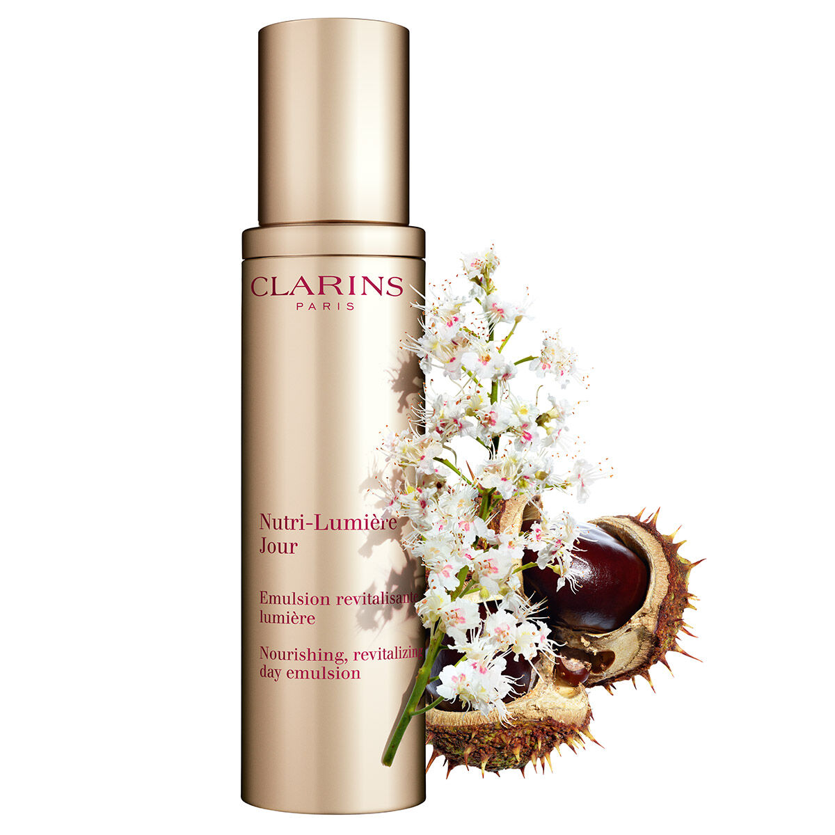 Innovation Pro-Ageing Nutrition Clarins. Die Laboratoires Clarins haben ein kraftvolles Aktivstoff-Duo entwickelt, das der Haut neue Leuchtkraft verleiht. Gewonnen aus der Rosskastanie, sind biologische Blütenextrakte und Eszine - aktive Moleküle aus der Frucht - aufgrund ihrer Wirkung auf das Mikronährstoffnetzwerk anerkannt. Dieses Vital-Duo, hervorgegangen aus der Expertise der Laboratoires Clarins, optimiert die Verteilung der Nährstoffe in der Haut. Sie ist besser genährt und wieder voller Leuchtkraft. Die leichte, nicht ölige Emulsion-in-Öl-Textur ist ideal, um nährstoffarme Haut zu revitalisieren, intensiv zu nähren und ihre Leuchtkraft zu wecken. Sie ist für jeden Hauttyp geeignet.