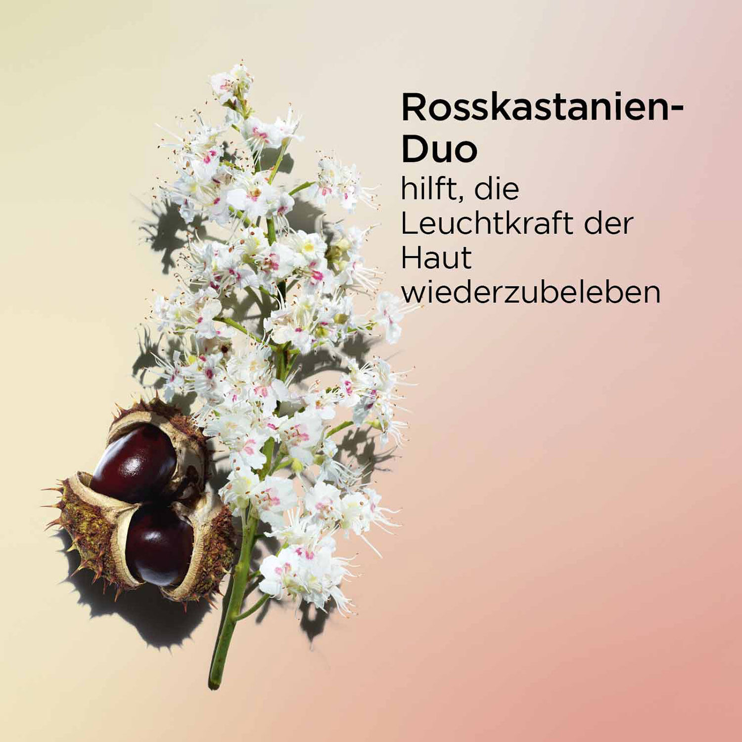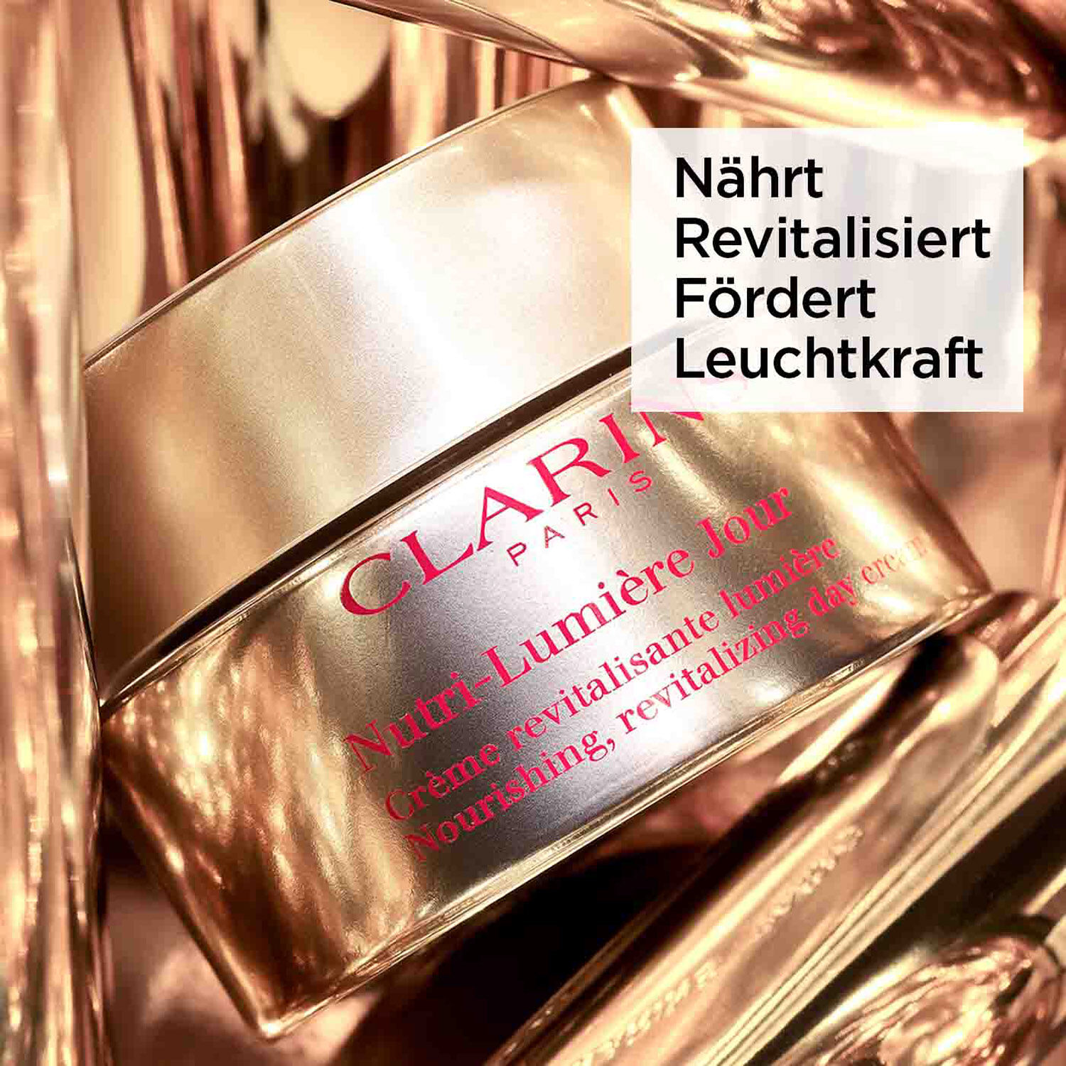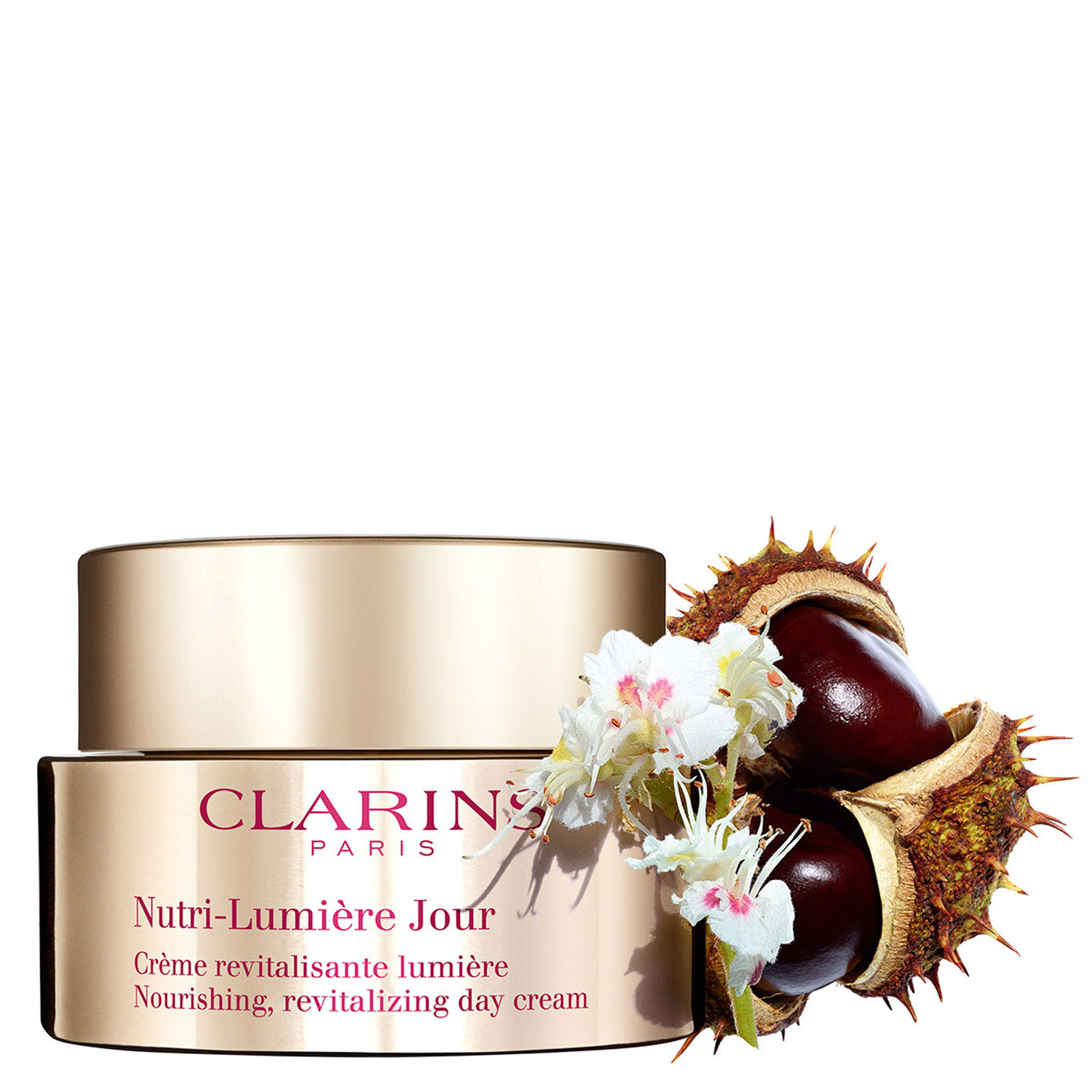 Innovation Pro-Ageing Nutrition Clarins. Die Laboratoires Clarins haben ein kraftvolles Aktivstoff-Duo entwickelt, das der Haut neue Leuchtkraft verleiht. Gewonnen aus der Rosskastanie, sind biologische Blütenextrakte und Eszine - aktive Moleküle aus der Frucht - aufgrund ihrer Wirkung auf das Mikronährstoffnetzwerk anerkannt. Dieses Vital-Duo, hervorgegangen aus der Expertise der Laboratoires Clarins, optimiert die Verteilung der Nährstoffe in der Haut. Sie ist besser genährt und wieder voller Leuchtkraft. Die gehaltvoll schmelzende Creme-in-Öl-Textur von Nutri-Lumière Jour ist ideal, um nährstoffarme Haut zu revitalisieren, intensiv zu nähren und ihre Leuchtkraft zu wecken. Sie ist für jeden Hauttyp geeignet.