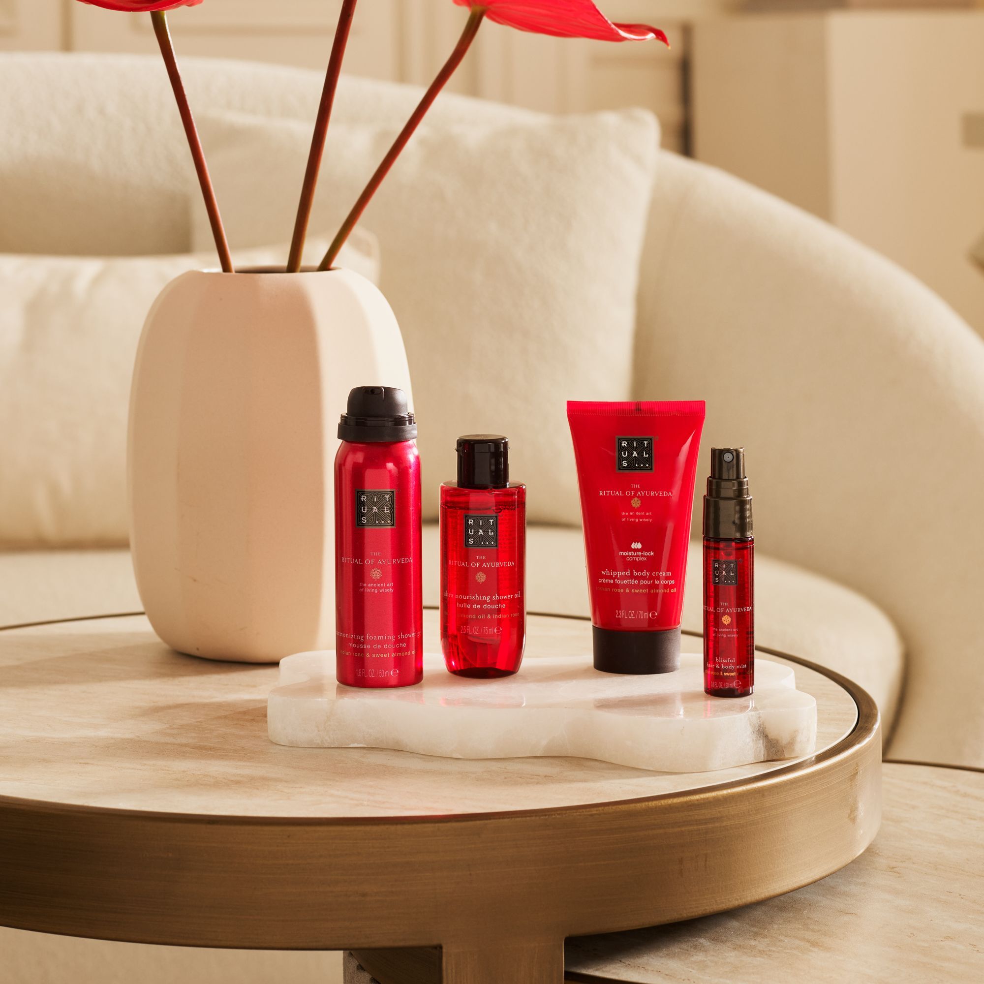 The Ritual Of Ayurveda Foaming Shower Gel 50ml: Aqua/Water, Sodium Coco-Sulfate, Decyl Glucoside, Isopentane, Coco-Glucoside, Glycerin, PEG-120 Methyl Glucose Dioleate, Isopropyl Palmitate, Parfum/Fragrance, Isobutane, Rosa Damascena Flower Oil, Prunus Amygdalus Dulcis (Sweet Almond) Oil, Citric Acid, Sodium Benzoate, Guar Hydroxypropyltrimonium Chloride, Hexyl Cinnamal, Limonene, Linalool, Coumarin, Citronellol, Benzyl Benzoate.The Ritual Of Ayurveda Shower Oil 75ml: Brassica Campestris (Rapeseed) Seed Oil, Ricinus Communis (Castor) Seed Oil, Mipa-Laureth Sulfate, Laureth-3, Caprylic/Capric Triglyceride, Parfum/Fragrance, Glyceryl Caprylate/Caprate, Laureth-7 Citrate, Prunus Amygdalus Dulcis (Sweet Almond) Oil, Cocos Nucifera (Coconut) Oil, Moringa Oleifera Seed Oil, Rosa Damascena Flower Water, Tocopherol, Helianthus Annuus (Sunflower) Seed Oil, Hydrogenated Palm Glycerides Citrate, Benzyl Benzoate, Citral, Citronellol, Coumarin, Hexyl Cinnamal, Linalool, Limonene, Sodium Benzoate, Potassium Sorbate, Sorbic Acid.The Ritual Of Ayurveda Hair Body Mist 20ml: Aqua/Water, PEG-40 Hydrogenated Castor Oil, Parfum/Fragrance, Rosa Damascena (Damask Rose) Flower Water, Prunus Amygdalus Dulcis (Sweet Almond) Seed Extract, Sodium Benzoate, Hexyl Cinnamal, Limonene, Linalyl Acetate, Potassium Sorbate, Linalool, Citrus Aurantium Peel Oil, Coumarin, Tetramethyl Acetyloctahydronaphthalenes, Acetyl Cedrene, Citronellol, Benzyl Benzoate, Geranyl Acetate, Pinene, Anethole, Citral, Citric Acid, Terpineol, Glycerin, Benzyl Alcohol, Rose Ketones, Beta-Caryophyllene, Cananga Odorata Oil/Extract, Dimethyl Phenethyl Acetate, Alpha-Isomethyl Ionone, Terpinolene, Cinnamyl Alcohol, Benzyl Cinnamate, Vanillin, Geraniol, Sorbic Acid.The Ritual Of Ayurveda Body Cream 70ml: Etearyl Alcohol, Glyceryl Stearate Se, Ethylhexyl Stearate, Butyrospermum Parkii (Shea) Butter, Dicaprylyl Ether, Helianthus Annuus (Sunflower) Hybrid Oil, Isopropyl Palmitate, Myristyl Myristate, Zea Mays (Corn) Starch, Parfum/Fragrance, Glyceryl Stearate Citrate, Rosa Damascena Flower Extract, Prunus Amygdalus Dulcis (Sweet Almond) Oil, Adansonia Digitata Seed Oil, Pseudozyma Epicola/Safflower Seed Oil Ferment Extract Filtrate, Tocopheryl Acetate, Tocopherol, Ubiquinone, Helianthus Annuus (Sunflower) Seed Oil, Citrus Aurantium Peel Oil, Sodium Cetearyl Sulfate, Phenoxyethanol, Benzyl Alcohol, Hexyl Cinnamal, Limonene, Linalyl Acetate, Linalool, Coumarin, Tetramethyl Acetyloctahydronaphthalenes, Acetyl Cedrene, Citronellol, Benzyl Benzoate, Geranyl Acetate, Pinene, Anethole, Citral, Terpineol, Rose Ketones, Beta-Caryophyllene, Cananga Odorata Oil/Extract, Citric Acid, Sodium Hydroxide