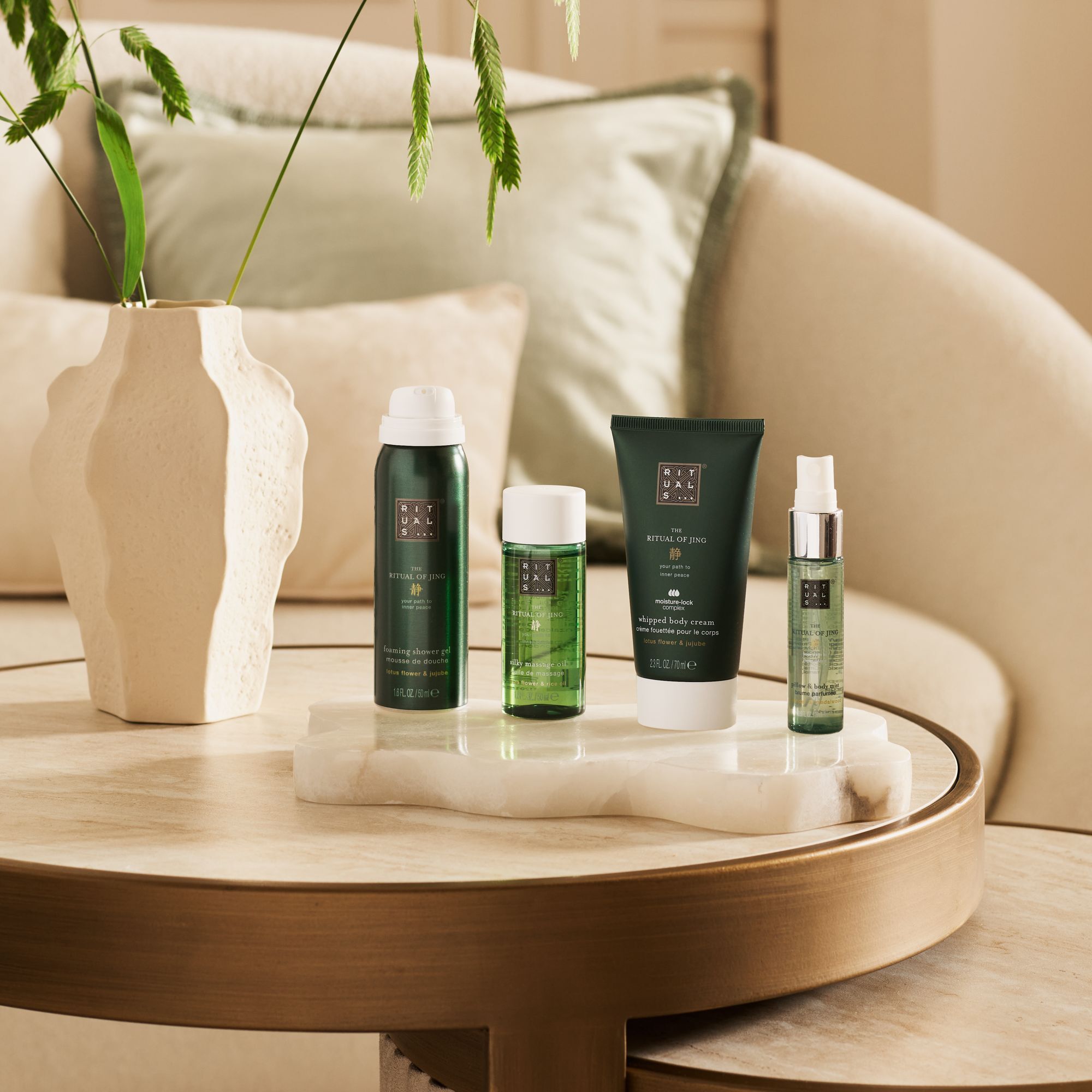 The Ritual Of Jing Foaming Shower Gel 50ml: Aqua/Water, Sodium Coco-Sulfate, Sorbitol, Coco-Glucoside, Isopentane, Caprylyl/Capryl Glucoside, Cocamidopropyl Betaine, Parfum/Fragrance, Isopropyl Palmitate, PEG-120 Methyl Glucose Dioleate, Isobutane, Ziziphus Jujuba (Jujube) Fruit Extract, Nelumbo Nucifera (Lotus) Flower Extract, Citric Acid, Sodium Benzoate, Sodium Chloride, Benzyl Salicylate, Glycerin, Guar Hydroxypropyltrimonium Chloride, Hexyl Cinnamal, Tetramethyl Acetyloctahydronaphthalenes, Linalool, Alpha-Isomethyl Ionone, Amyl Salicylate, Butylene Glycol, Tocopherol, Potassium Sorbate.The Ritual Of Jing Night Pillow Body Mist 20ml For Giftset: Aqua/Water, PEG-40 Hydrogenated Castor Oil, Parfum/Fragrance, Propylene Glycol, Caprylic/Capric Triglycerides, Lavandula Angustifolia (Lavender) Oil, Santalum Spicata (Sandalwood) Wood Oil, Glycerin, Benzyl Alcohol, Benzoic Acid, Sorbic Acid, Sodium Hydroxide, Citral, Coumarin, Farnesol, Geraniol, Limonene, Linalool.The Ritual Of Jing Massage Oil 50ml: Vitis Vinifera (Grape) Seed Oil, Brassica Campestris Seed Oil, Helianthus Annuus (Sunflower) Hybrid Oil, Prunus Amygdalus Dulcis (Sweet Almond) Oil, Parfum/Fragrance, Oryza Sativa Bran Oil, Nelumbo Nucifera (Lotus) Flower Extract, Helianthus Annuus (Sunflower) Seed Oil, Tocopherol, Squalane, Benzyl Salicylate, Hexyl Cinnamal, Linalool, Alpha-Isomethyl Ionone, Eugenol, Cinnamal, Isoeugenol, Tetramethyl Acetyloctahydronaphthalenes, Benzaldehyde.The Ritual Of Jing Body Cream 70ml: Aqua/Water, Glycerin, Cetearyl Alcohol, Glyceryl Stearate Se, Ethylhexyl Stearate, Butyrospermum Parkii (Shea) Butter, Dicaprylyl Ether, Helianthus Annuus (Sunflower) Hybrid Oil, Isopropyl Palmitate, Myristyl Myristate, Zea Mays (Corn) Starch, Parfum/Fragrance, Glyceryl Stearate Citrate, Zizyphus Jujuba Fruit Extract, Nelumbo Nucifera Flower Extract, Adansonia Digitata Seed Oil, Pseudozyma Epicola/Safflower Seed Oil Ferment Extract Filtrate, Tocopheryl Acetate, Tocopherol, Ubiquinone, Sodium Cetearyl Sulfate, Phenoxyethanol, Benzyl Alcohol, Benzyl Salicylate, Hexyl Cinnamal, Linalool, Alpha-Isomethyl Ionone, Citric Acid, Sodium Hydroxide.