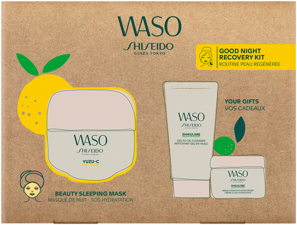 Waso Beauty Sleeping Mask Water(Aqua/Eau), Dipropylene Glycol, Alcohol Denat., Glycerin, Pentaerythrityl Tetraethylhexanoate, Maltitol, Dimethicone, Trehalose, Euphorbia Cerifera (Candelilla) Wax(Candelilla Cera/Cire De Candelilla), Phenoxyethanol, PEG-240/Hdi Copolymer BIS-Decyltetradeceth-20 Ether, Pyrus Malus (Apple) Fruit Water, Carbomer, Alcohol, Potassium Hydroxide, PEG/PPG-17/4 Dimethyl Ether, Lauroyl Lysine, Butylene Glycol, Sodium Metaphosphate, Ascorbyl Tetraisopalmitate, Sodium Metabisulfite, Disodium EDTA, Dextrin Palmitate, Acrylates/C10-30 Alkyl Acrylate Crosspolymer, Phytosteryl/Octyldodecyl Lauroyl Glutamate, Rosmarinus Officinalis (Rosemary) Leaf Oil (Rosmarinus Officinalis Leaf Oil), Iron Oxides (CI 77492), Limonene, Citrus Aurantium Dulcis (Orange) Oil, Lavandula Angustifolia (Lavender) Oil, Triisostearin, Citrus Junos Seed Extract, Trimethylolpropane Triethylhexanoate, Citrus Depressa Peel Extract, Citrus Junos Fruit Extract, Salvia Officinalis (Sage) Oil, Methicone, BHT, Tetradecene, Tocopherol Waso Gel-To-Oil Cleanser Hydrogenated Polydecene, Cetyl Ethylhexanoate, Sorbitol, Water(Aqua/Eau), Glycerin, Isododecane, Dimethicone, Diphenylsiloxy Phenyl Trimethicone, Sucrose Stearate, PPG-15-Buteth-20, Butylene Glycol, Vitis Vinifera (Grape) Seed Oil, Carthamus Tinctorius (Safflower) Seed Oil, PEG-60 Hydrogenated Castor Oil, Sodium Methyl Cocoyl Taurate, Xanthan GUM, Sodium Citrate, Citric Acid, Pyrus Malus (Apple) Fruit Water, Sodium Metaphosphate, Tocopherol, Citrus Depressa Peel Extract, Dipropylene Glycol, Alcohol, Trisodium EDTA, Phenoxyethanol, Iron Oxides (CI 77492), BHT Mega Hydrating Moisturizer :water(Aqua/Eau), Cetyl Ethylhexanoate, Hydrogenated Polydecene, Butylene Glycol, Dimethicone, Xylitol, Glycerin, Silica, Squalane, PEG-60 Glyceryl Isostearate, Alcohol, Stearyl Alcohol, Butyrospermum Parkii (Shea) Butter, Glyceryl Stearate, Erythritol, Behenyl Alcohol, Trehalose, Titanium Dioxide (CI 77891), Phenoxyethanol, Isostearic Acid, Hydrogenated Palm Oil, Mica, Pyrus Malus (Apple) Fruit Water, Elaeis Guineensis (Palm) Kernel Oil, Elaeis Guineensis (Palm) Oil, Chlorphenesin, Xanthan GUM, Dipropylene Glycol, Acrylates/C10-30 Alkyl Acrylate Crosspolymer, Disodium EDTA, Tin Oxide, Sodium Metaphosphate, Rosmarinus Officinalis (Rosemary) Leaf Oil (Rosmarinus Officinalis Leaf Oil), Sodium Polyacrylate, Limonene, Citrus Aurantium Dulcis (Orange) Oil, Lavandula Angustifolia (Lavender) Oil, Tocopherol, Iron Oxides (CI 77492), Citrus Depressa Peel Extract, Salvia Officinalis (Sage) Oil, Potassium Hydroxide, Plankton Extract, Citric Acid